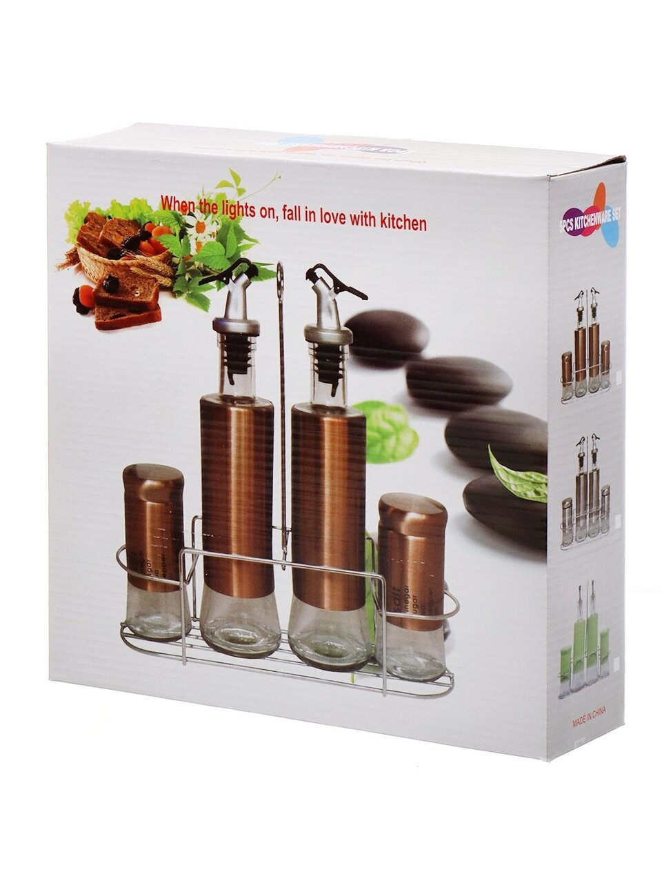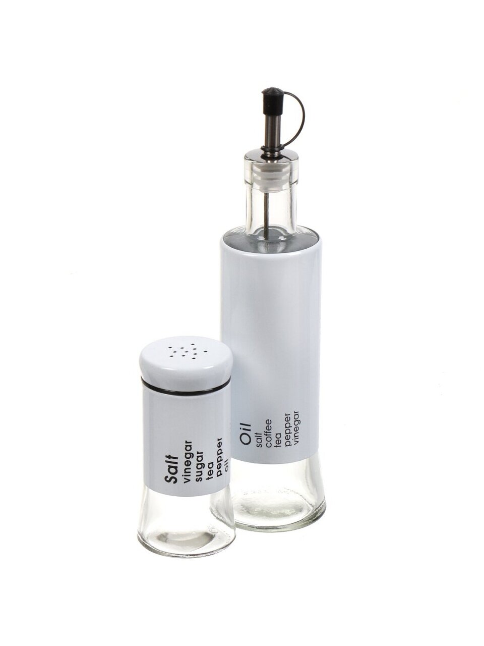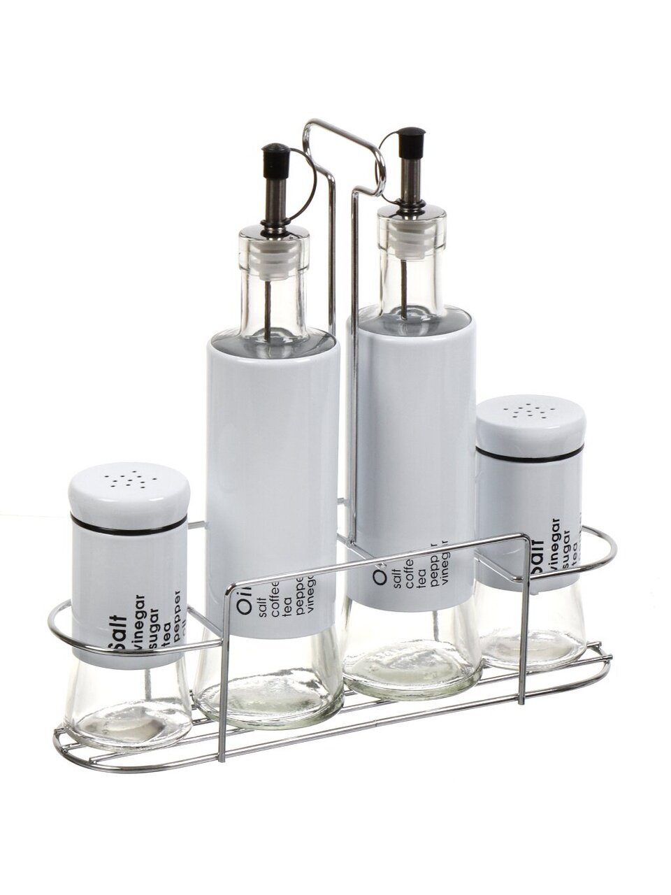 Набор состоит из 4 емкостей для специй и подставки. Емкости выполнены из прозрачного стекла и нержавеющей стали белого цвета, а также снабжены крышками предназначенными для дозирования. Металлическая подставка позволит удобно расположить специи на кухне.