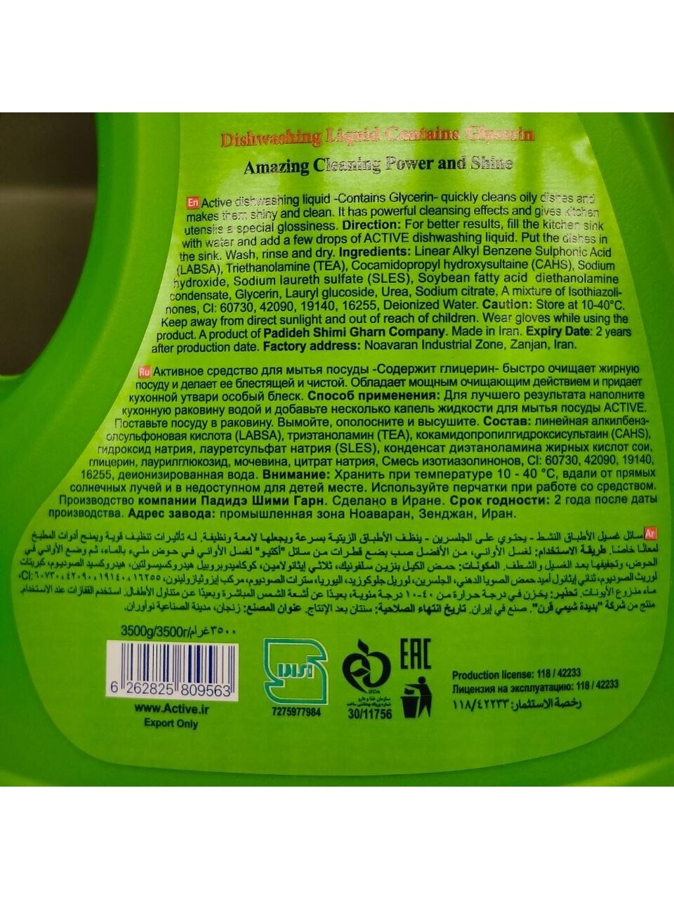 Средство для мытья посуды Active - лучшее решение для безупречной чистоты. Содержит глицерин, который быстро удаляет жир с посуды и делает ее блестящей. Гель полностью смывается водой и подходит для мытья детской посуды, бутылочек и игрушек.