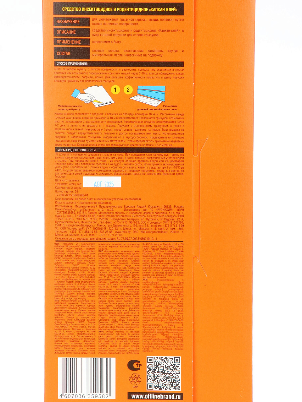 В упаковке 2 клеевые ловушки бренда Грызунофф Оффлайн, артикул GR10370041, страна продавца — Россия. Форма выпуска — клеевая пластина с активным клеевым слоем.