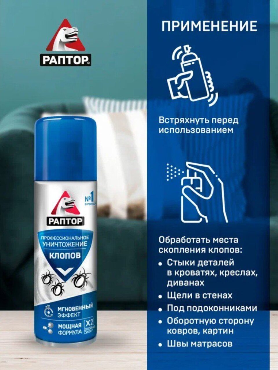 Клопы чувствуют себя в вашей квартире как дома? А место для отдыха и спокойного сна больше напоминает поле битвы? Положите конец этой кровопролитной войне вместе с Раптор! С гордостью представляем профессиональное средство от клопов в аэрозольной форме.