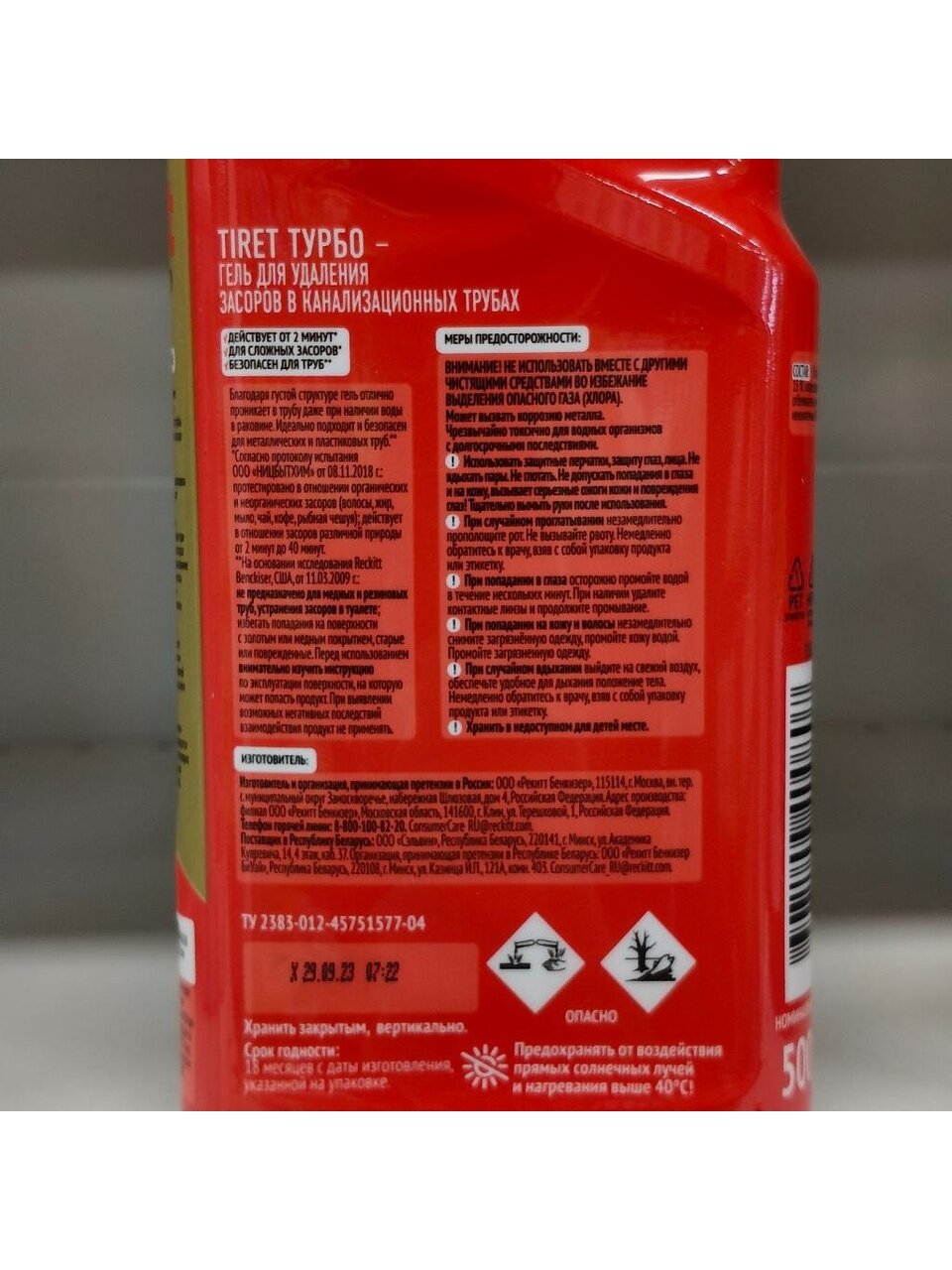 Средство для прочистки канализационных труб TIRET Turbo эффективно против микробов, устраняет засоры и неприятный запах. Предназначено для металлических и пластиковых труб.