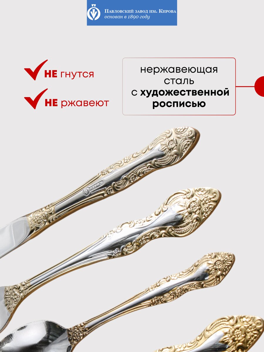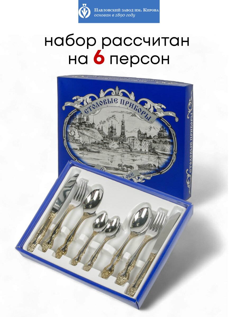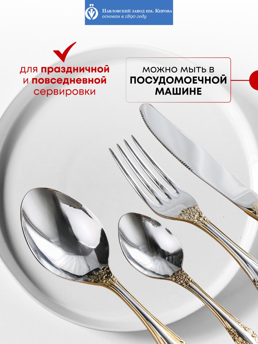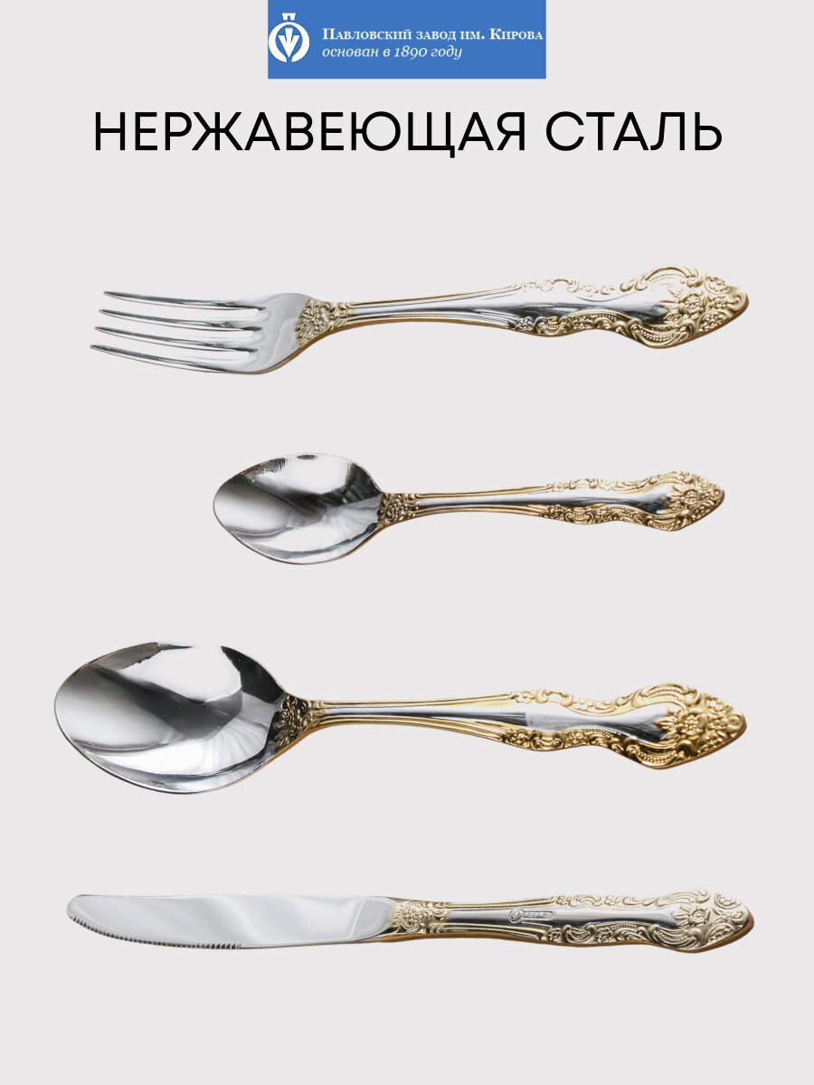 Премиальный набор столовых приборов из нержавеющей стали с золотым напылением — стильный подарок на 8 марта и для сервировки стола на 6 персон. Павловский завод им. Кирова, коллекция Тройка М-3.