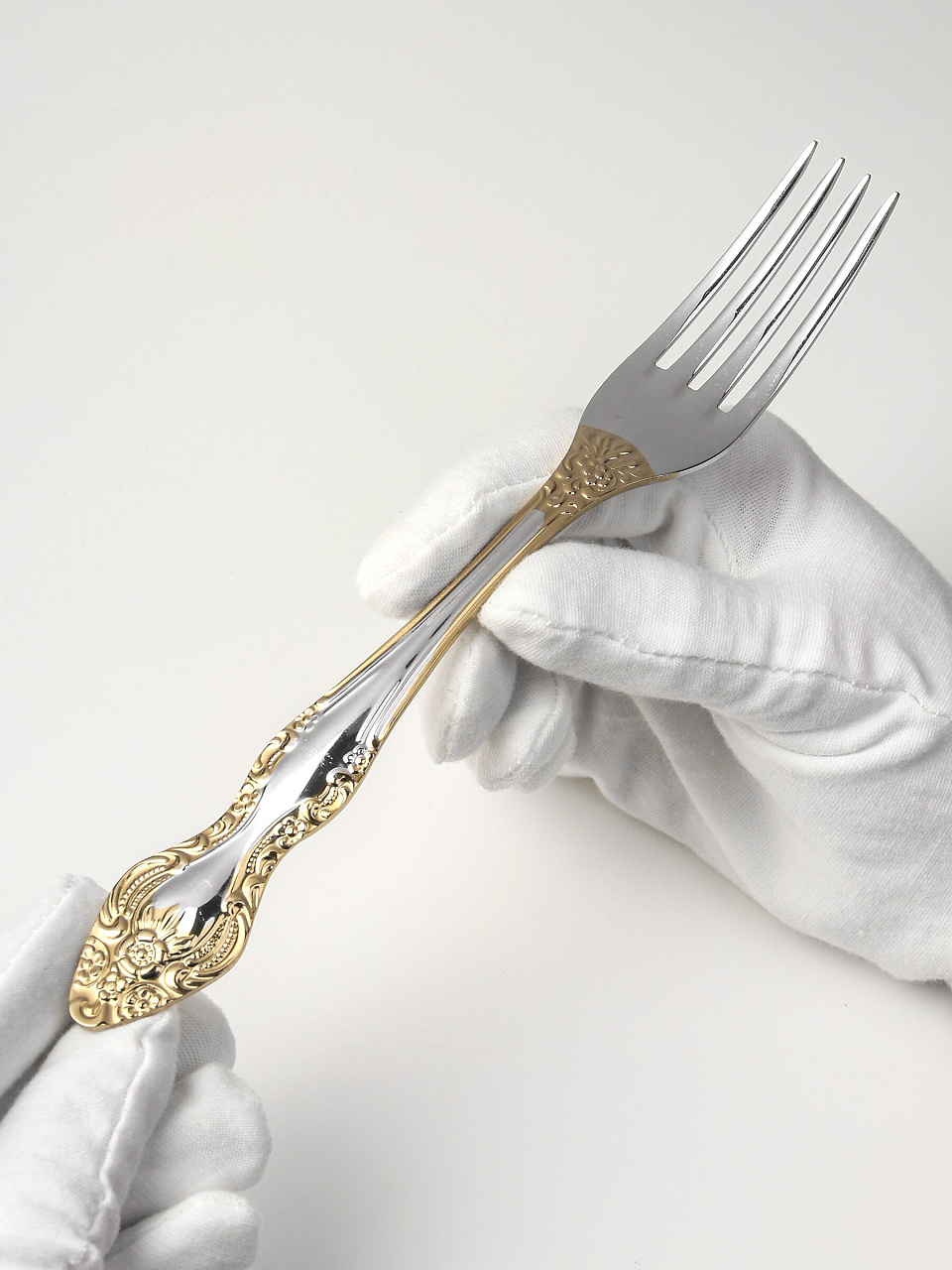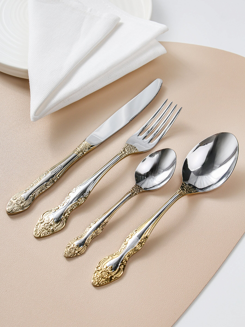 - Эксклюзивное сочетание — нержавеющая сталь с золотым напылением и фигурные ручки для элегантного стола
