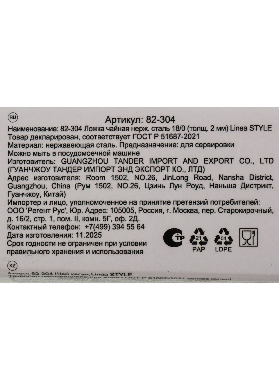 Ложка выполнена из нержавеющей стали 18/10 (марка 82-304), устойчива к коррозии, подходит для мытья в посудомоечной машине без потери блеска.