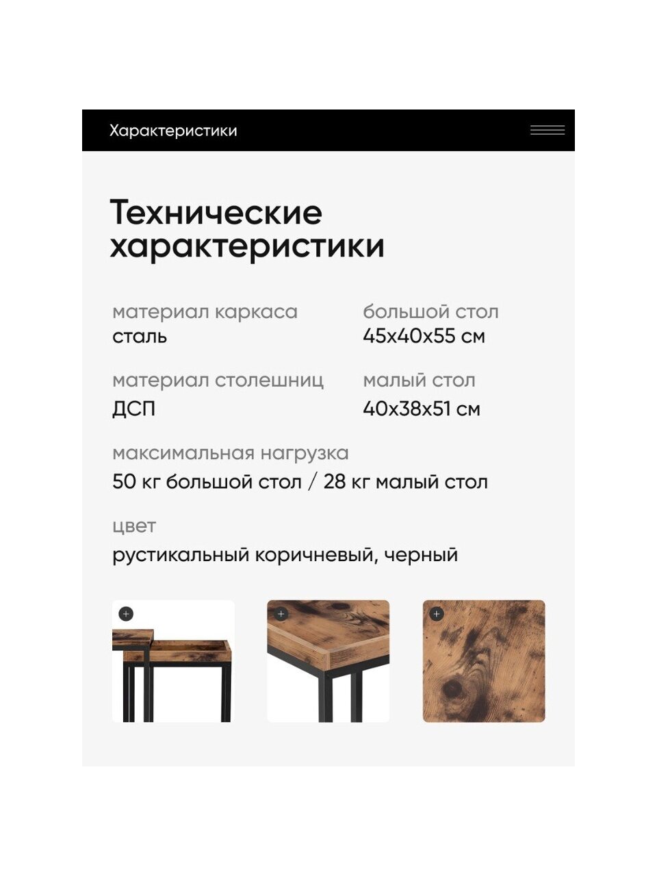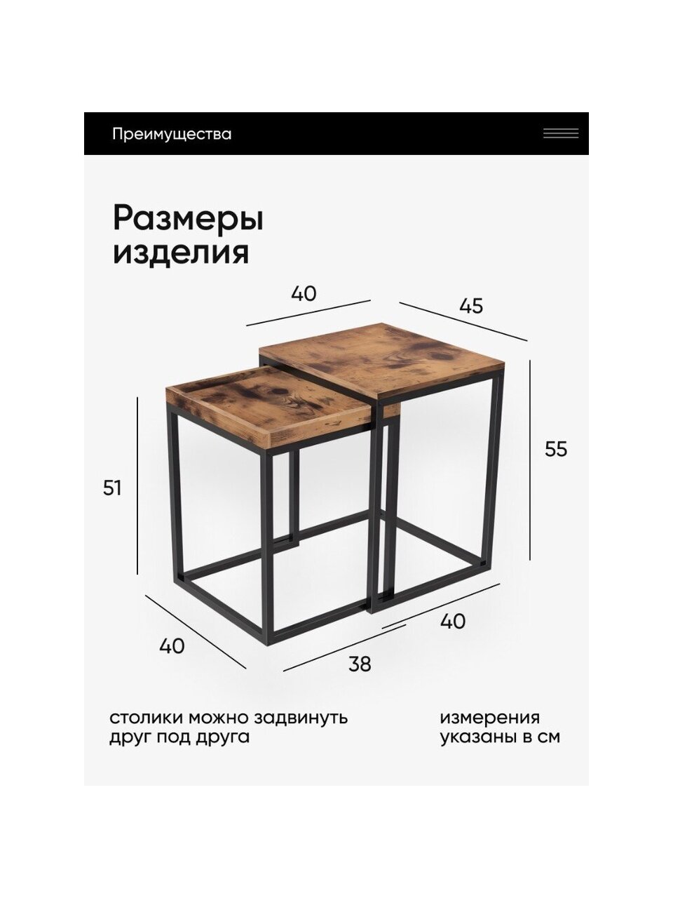 - Размер малого стола: 40 x 38 x 51 см см