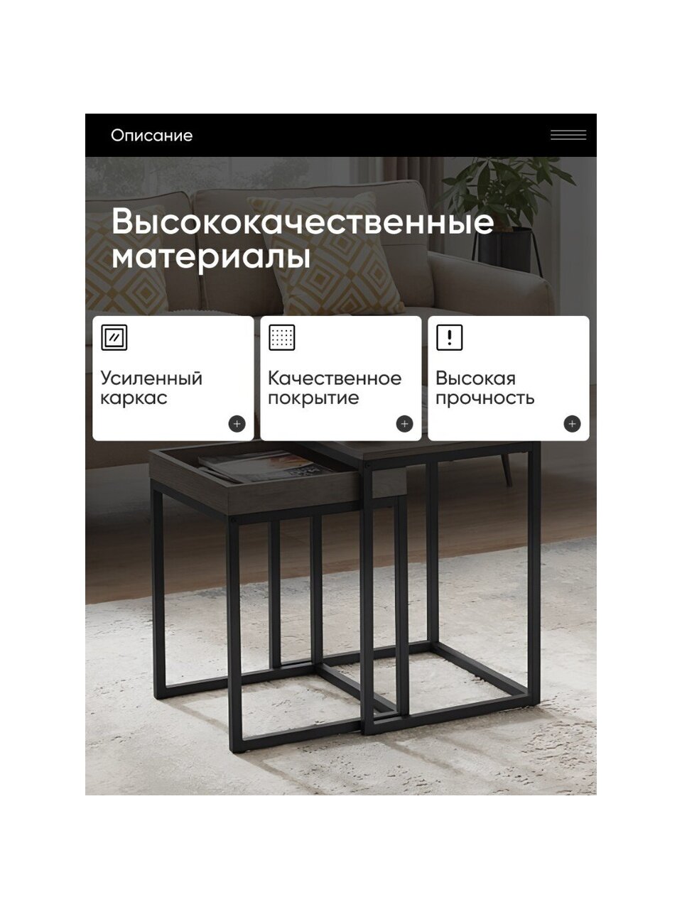 Используйте 2 боковых столика в паре, чтобы создать уникальный журнальный столик перед диваном. Их легко сложить вместе, чтобы сэкономить место или спрятать ваши пульты дистанционного управления. Также вы можете разделить их на 2 комнаты для большего удобства.