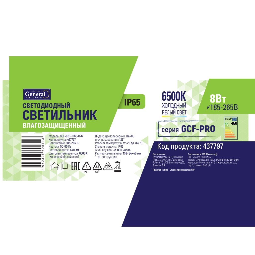 Вы можете приобрести «Светильник светодиодный General Lighting Systems, ЖКХ, 8 Вт, 6500 К, 640 Лм, IP65, 15.8х8.4х4.6 см, холодный белый свет, GCF-8BT-IP65-O-6» и другие товары в нашем интернет-магазине в Тамбове по низким ценам и с бесплатным самовывозом.