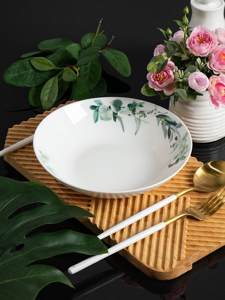 - Дизайн с растительным орнаментом «Эвкалипт» — современное решение для стильной сервировки и уютных обедов