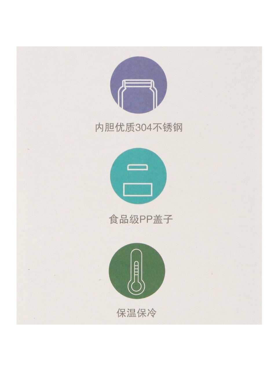 Объём — 0.48 л (округлённо 0.5 л), корпус выполнен из нержавеющей стали и полимера, диаметр горлышка — 7.4 см, цвет — сиреневый.
