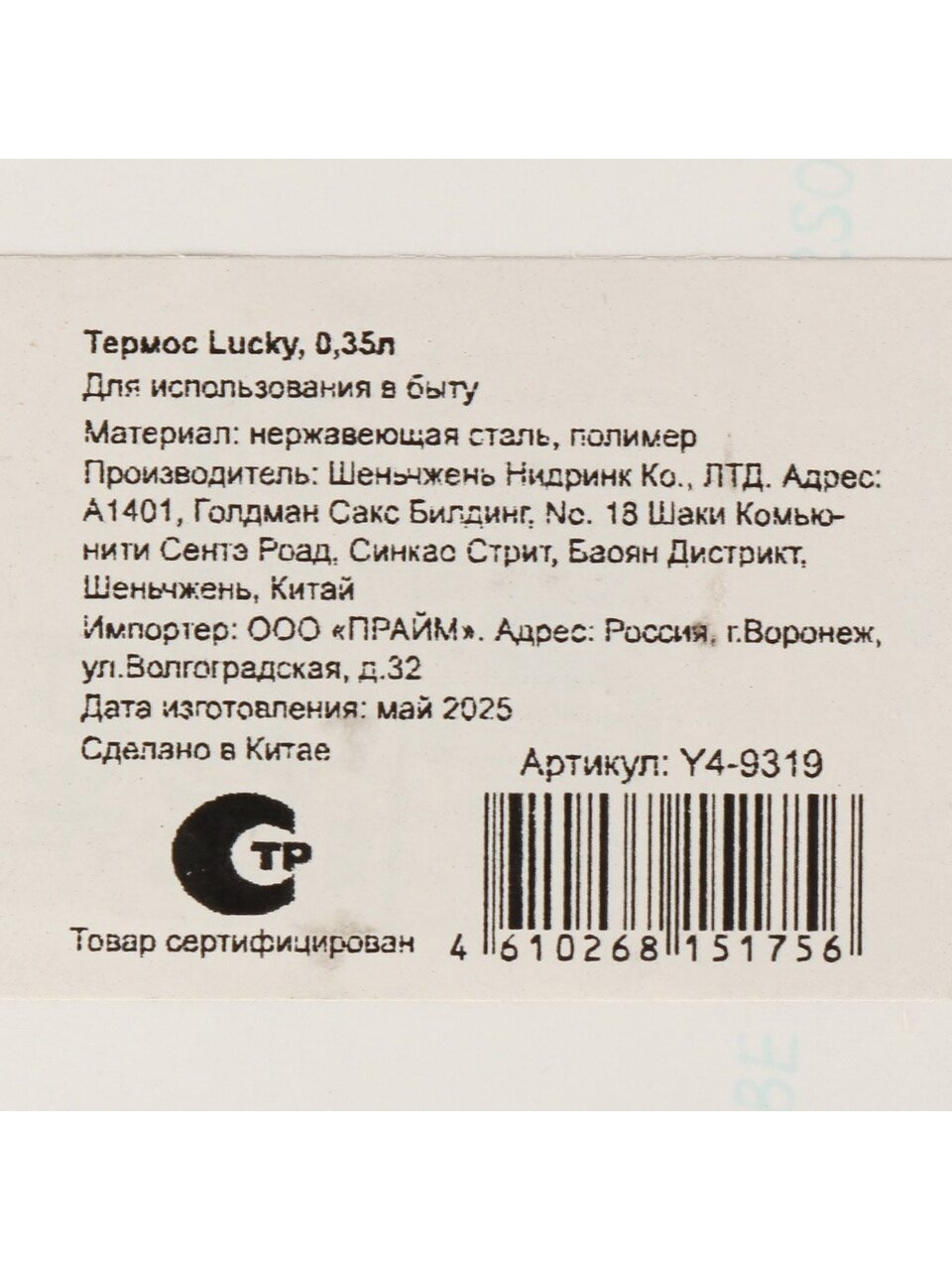 Термос Lucky 350 мл из нержавеющей стали — ваш стильный спутник для города и похода: сохраняет температуру до 8 часов, компактный и герметичный, идеально для кофе и чая.