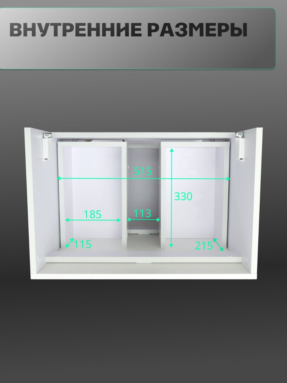 Ширина тумбы — 60 см, предусмотрено 2 вместительных ящика с системой скрытых направляющих и автоматическим возвратом. Этого достаточно для хранения бытовой химии, полотенец и аксессуаров.