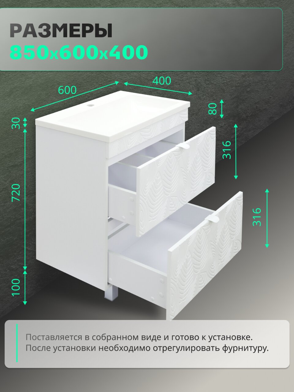 Тумба специально разработана для умывальника Art 60. Совместимость гарантирована производителем — монтаж не требует доработок.