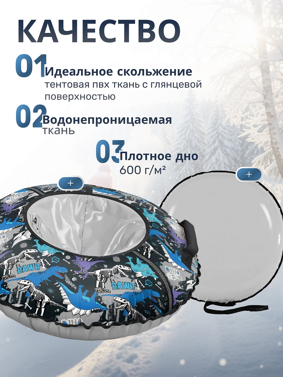 - Материал тюбинга обладает водоотталкивающими свойствами и устойчивостью к низким температурам.