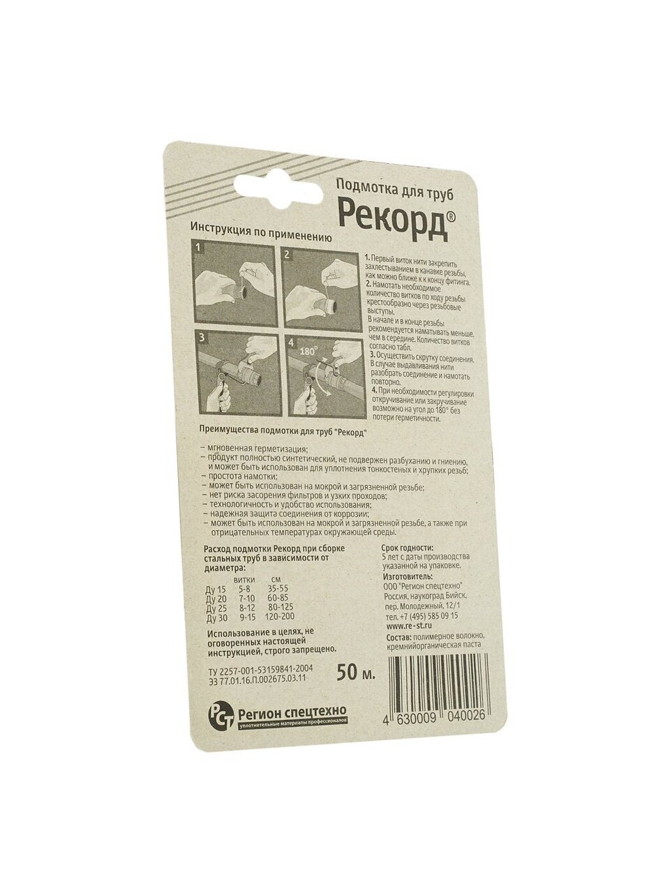 Подмотка для труб «Рекорд» — сантехническая полимерная нить, состоящая из 280 элементарных нитей, пропитанных специальным герметизирующим составом. Предназначена для уплотнения резьбовых металлических и пластиковых соединений. Надежно герметизирует не только новые, но и загрязненные, частично разрушенные, тонкостенные и мокрые резьбы. В состав пропитки входит силикон, который защищает поверхность резьбы от коррозии. Продукт имеет СЭЗ на применение в системах с горячей и холодной питьевой водой. Соединение, собранное с применением нити «Рекорд» имеет высокую вибростойкость.