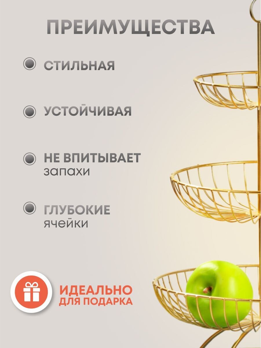 Металлическая этажерка прочнее, не впитывает запахи, устойчива к деформации и служит дольше. Золотое покрытие придаёт ей премиальный вид, а три яруса позволяют разместить больше фруктов или десертов.