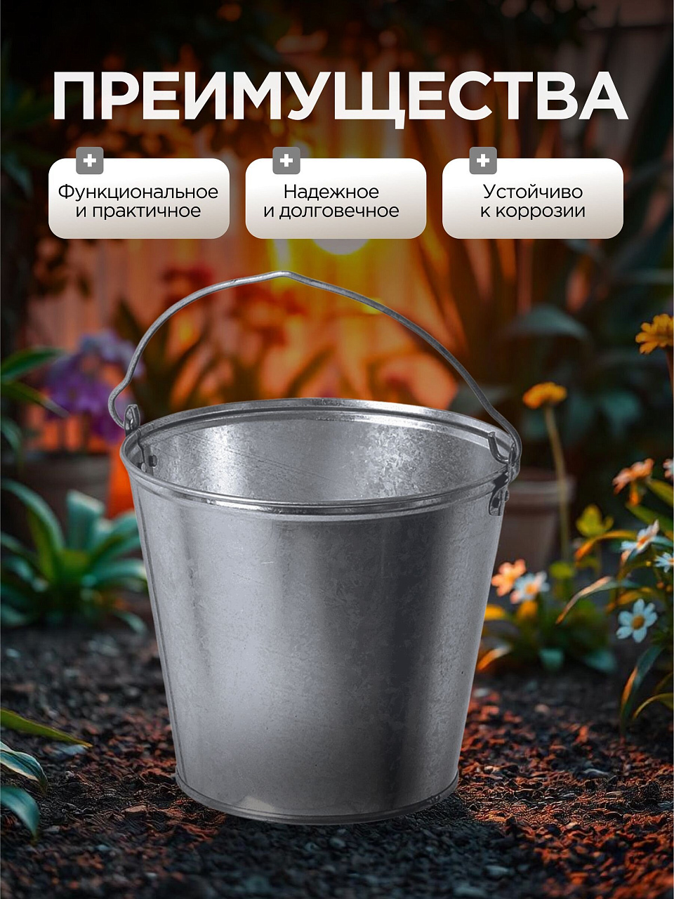 - Оцинкованное ведро по ГОСТ — устойчивая к коррозии сталь, не требует сложного ухода;