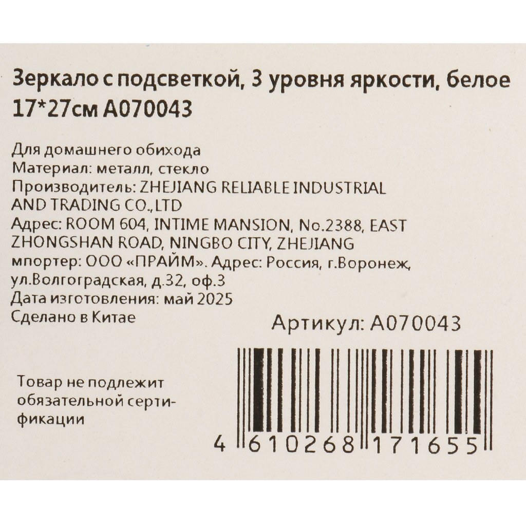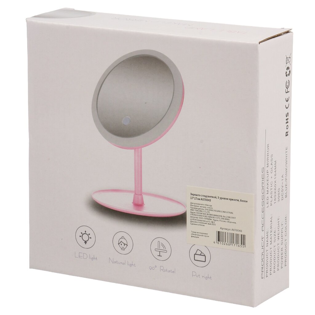 Зеркало настольное, 17х27 см, с подсветкой, 3 уровня яркости, бел, A070043
